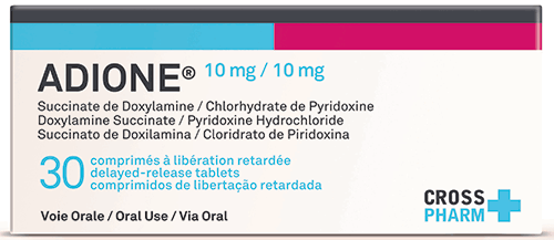 Adione® 10 mg / 10 mg (Succinate de Doxylamine / Chlorhydrate de Pyridoxine), comprimés entériques enrobés à libération retardée.
