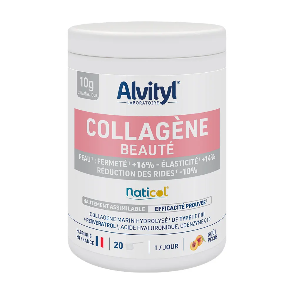Alvityl® Collagène Beauté est une formule unique composée de Collagène Naticol®, Resveratrol², Acide Hyaluronique et CoEnzyme Q10 pour un apport de 10 g par jour de collagène hydrolysé. Le Collagène Naticol® de type I et III est d’origine marine et pur à 99%, dans sa forme sèche. Il est fabriqué en France et de bas poids moléculaire, offrant une haute biodisponibilité. Le collagène est hydrolysé en peptides avec un profil d’acides aminés unique (glycine, proline, hydroxyproline,…) et proche de celui du collagène humain. Une étude clinique³ a montré la bonne absorption du Collagène Naticol® dans le plasma et donc une assimilation optimale par l’organisme. Des études cliniques ¹ démontrent son efficacité sur la beauté de la peau. Il améliore l’élasticité (+14%) et la fermeté (+16%) de la peau, tout en réduisant l’apparence des rides(-10%).