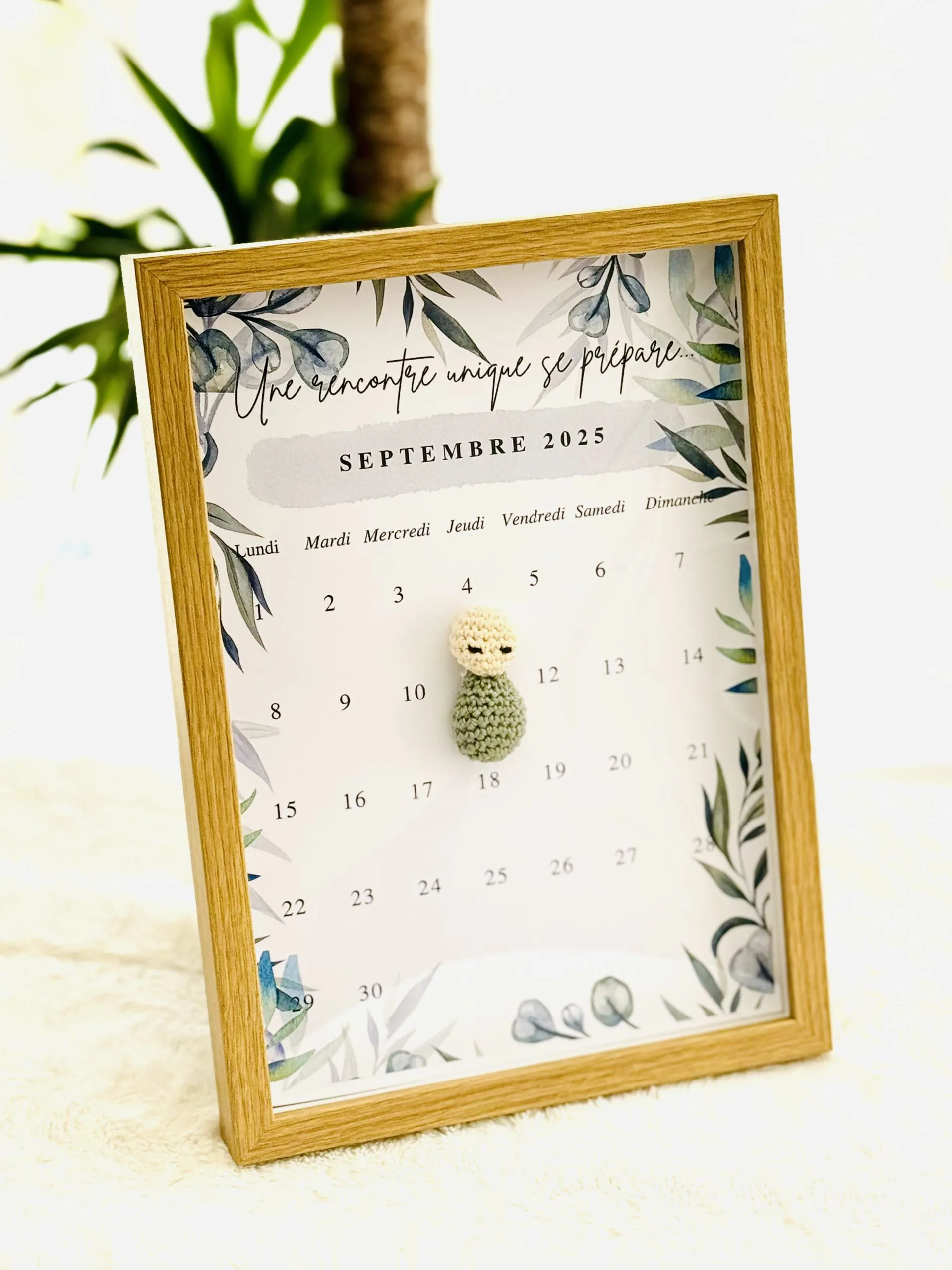 Le tableau annonce grossesse crochet est une façon douce et poétique d’annoncer l’arrivée d’un bébé. Présenté sous forme de cadre décoratif, il contient un bébé en crochet fait main, posé sur la date du terme prévu, suspendu comme un symbole d’attente et de bonheur à venir.