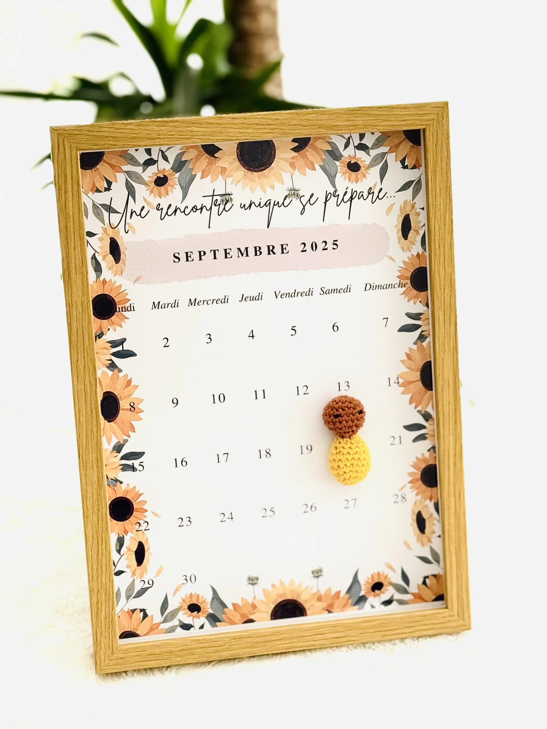 Le tableau annonce grossesse crochet est une façon douce et poétique d’annoncer l’arrivée d’un bébé. Présenté sous forme de cadre décoratif, il contient un bébé en crochet fait main, posé sur la date du terme prévu, suspendu comme un symbole d’attente et de bonheur à venir.