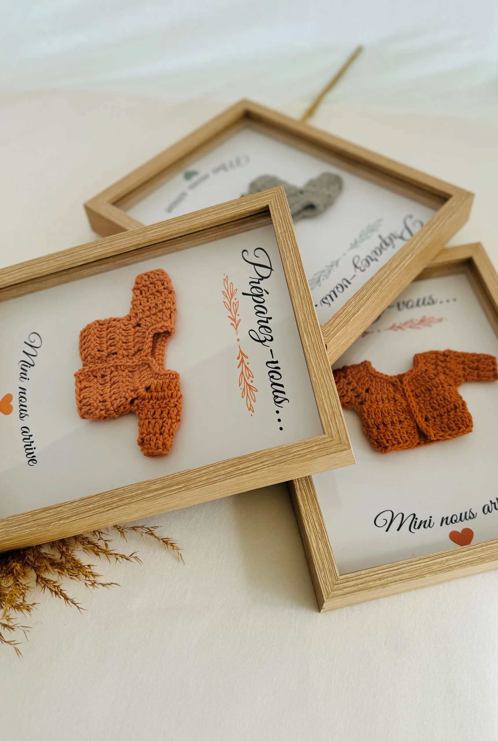 Le tableau annonce grossesse crochet est une façon douce et poétique d’annoncer l’arrivée d’un bébé. Présenté sous forme de cadre décoratif, il contient un gilet en crochet fait main, suspendu comme un symbole d’attente et de bonheur à venir.