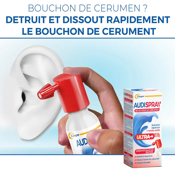 Audispray Ultra est un produit innovant permettant de traiter un bouchon d’oreille formé ou en formation, chez soi et en douceur. La solution de traitement Audispray Ultra dissocie le bouchon de cérumen dans un premier temps et dissout ses fragments dans un deuxième temps.