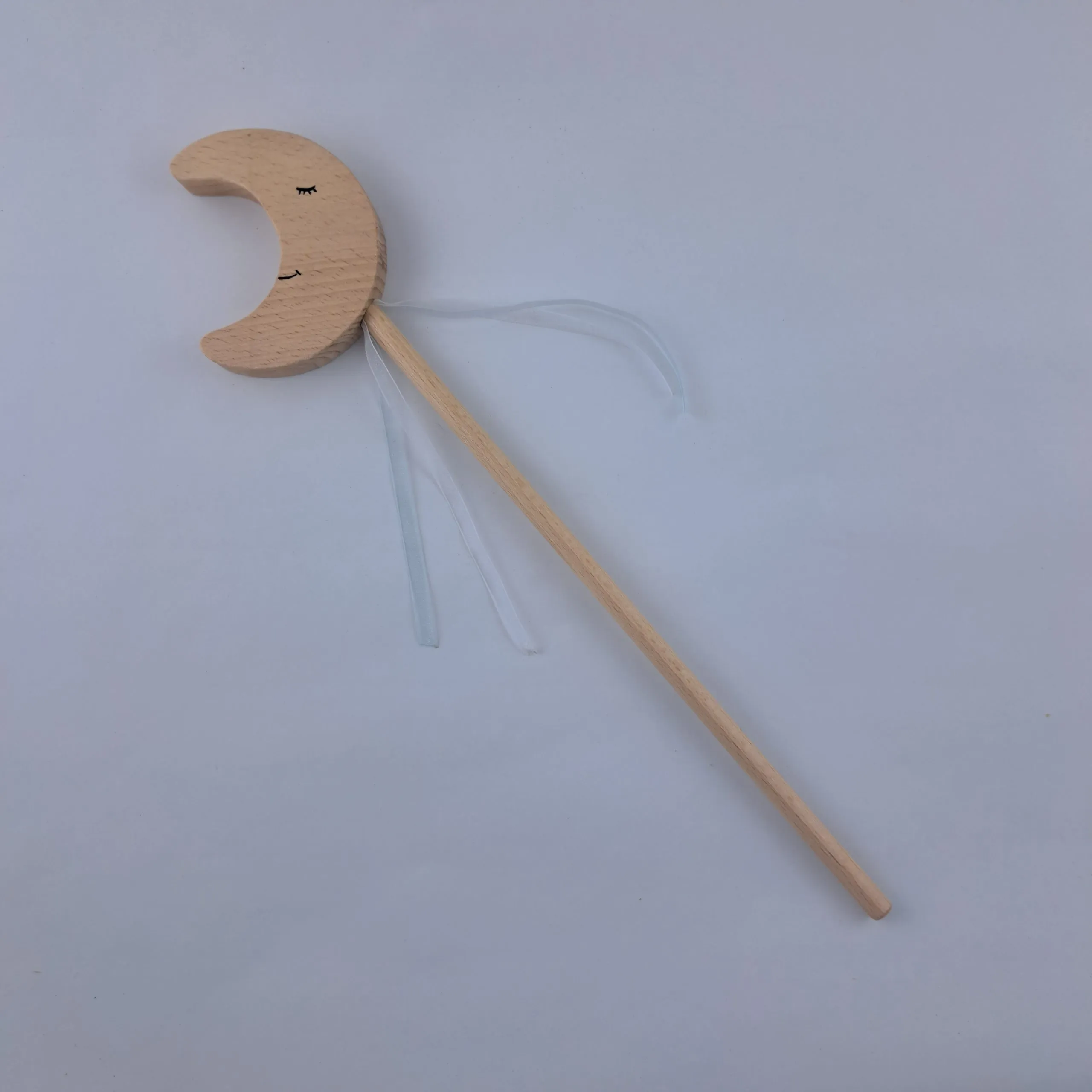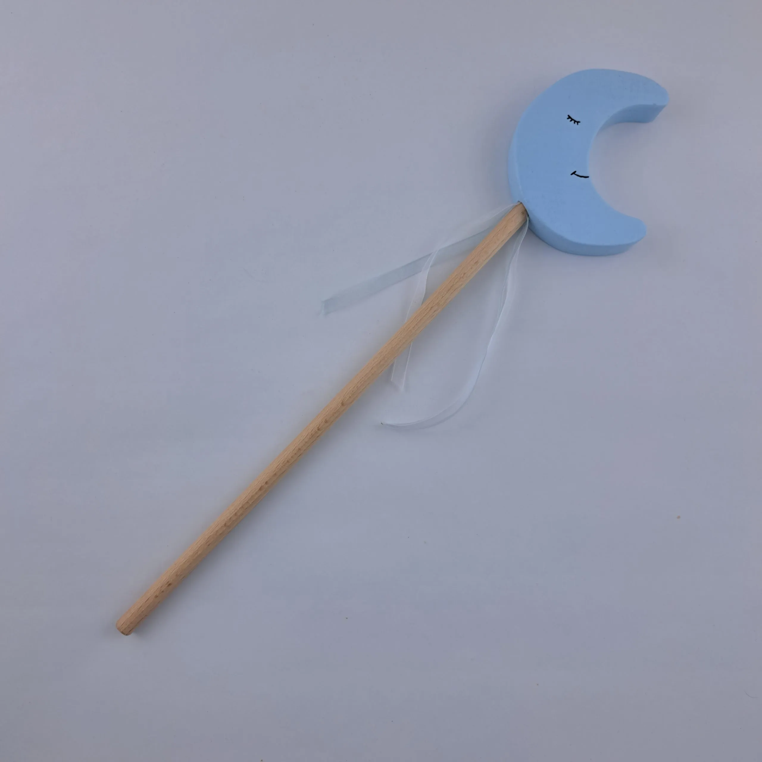 🌙 Baguette de fée en bois – LuneBois verni satinéVisage peint à la mainRuban décoratif bleu et blanc fixéStimule imagination et jeu créatifSécurité conforme EN 71-3 ✅Convient dès 5 ans
