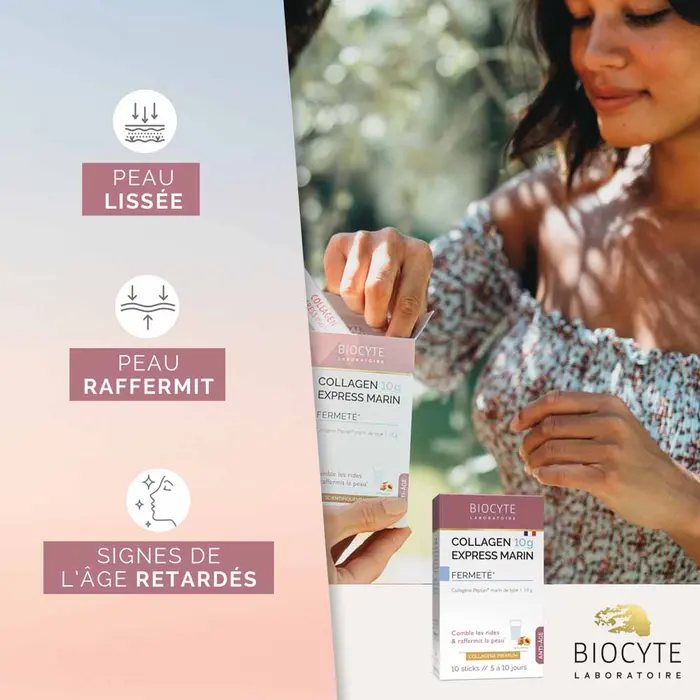Biocyte Collagen Express Marin agit sur la profondeur des rides grâce à l’efficacité anti-âge du collagène. Avec 10g de collagène par jour (2 sticks), les signes de l’âge sont retardés et le capital jeunesse de la peau est préservé.