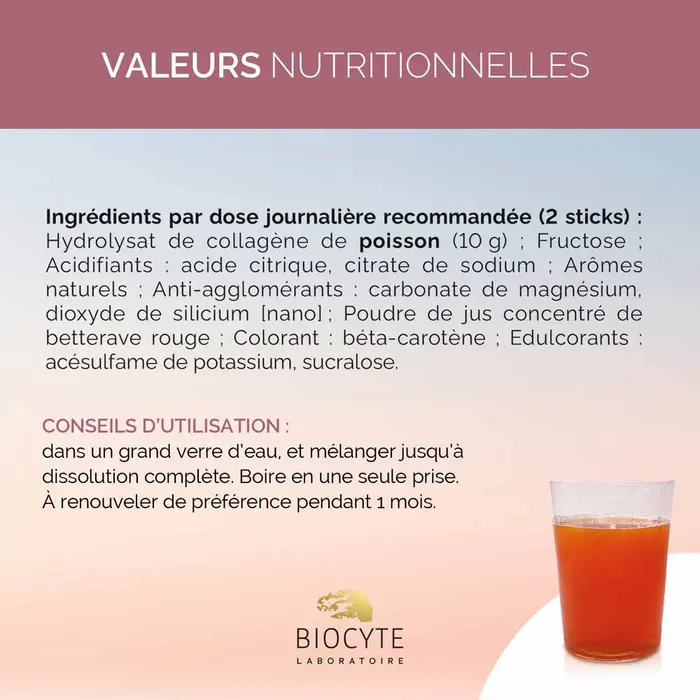 Formule INCI : Hydrolysat de collagène de POISSON ; Fructose ; Acidifiants : acide citrique, citrate de sodium ; Arômes naturels ; Anti-agglomérants : carbonate de magnésium, dioxyde de silicium [nano] ; Poudre de jus concentré de betterave rouge ; Colorant : bêta-carotène ; Édulcorants : acésulfame de potassium, sucralose.
