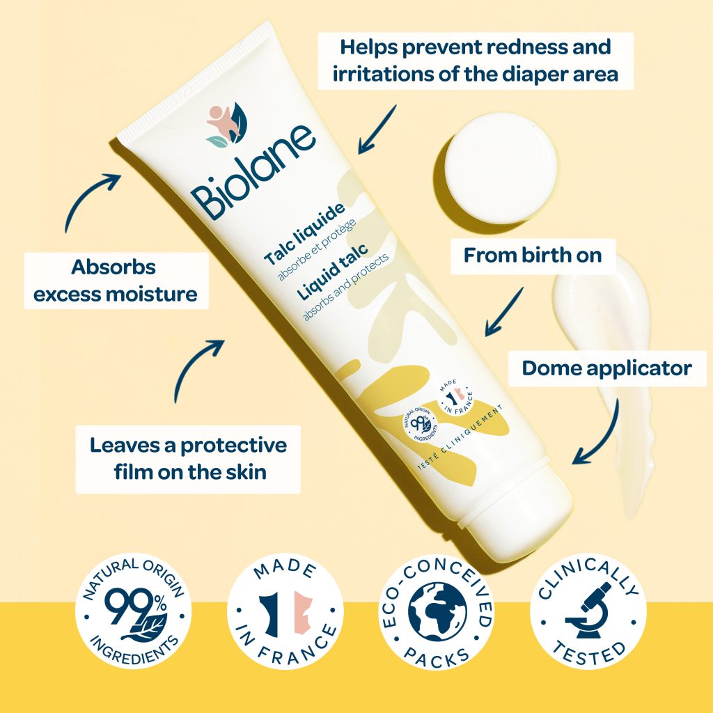 Composé à 99 % d’ingrédients d’origine naturelle , le talc liquide Biolane est spécialement formulé pour prévenir l’érythème fessier.