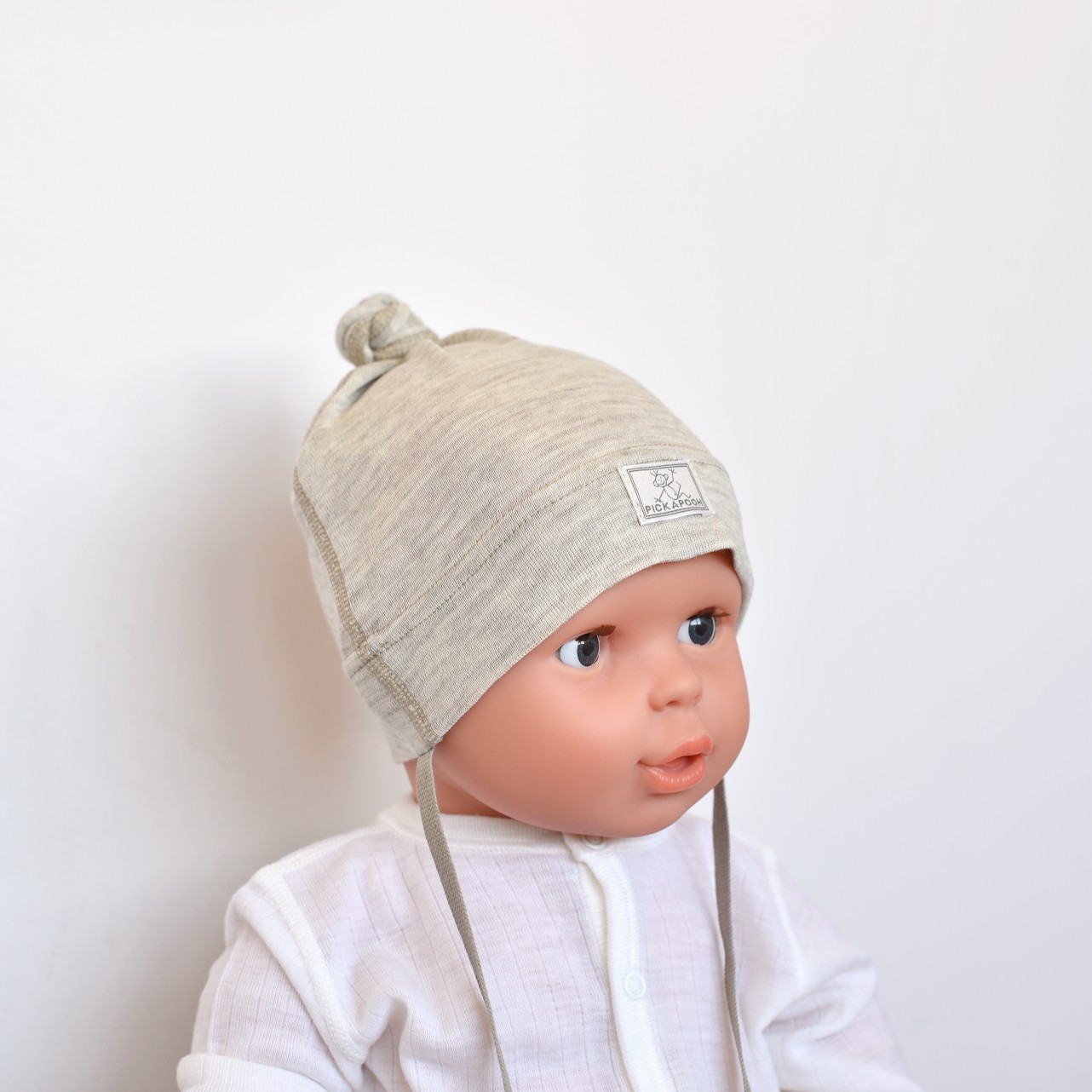 Bonnet bébé à noeud en laine mérinos et soie – beige Pickapooh