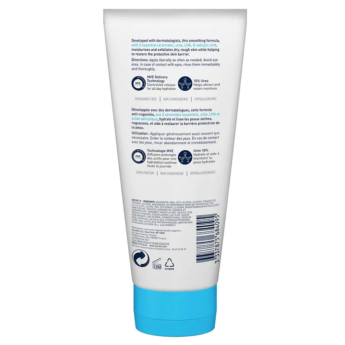 La formule de cette crème est enrichie à 10 % d’urée, un actif qui contribue à adoucir la texture de la peau et à préserver son hydratation. Elle contient également de l’acide salicylique, un exfoliant doux qui élimine les cellules cutanées mortes en surface, favorisant ainsi un aspect plus lisse. De plus, les trois céramides essentiels présents aident à réparer et à renforcer la barrière protectrice naturelle de la peau.