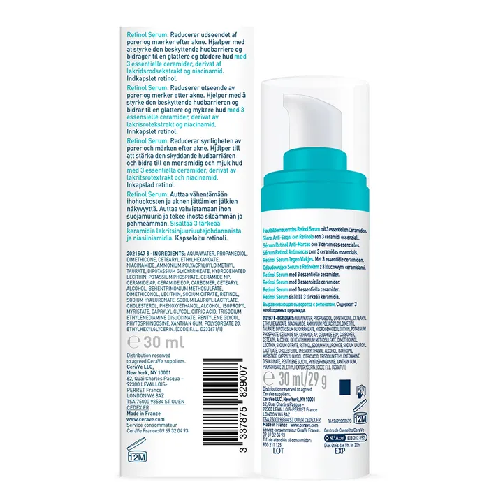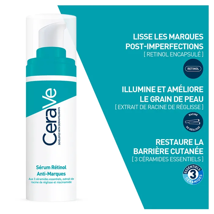 Développé avec des dermatologues, le Sérum Rétinol Anti-Marques CeraVe réduit l’apparence des marques persistantes post-acné (hyperpigmentation post- inflammatoire ou PIH), resserre les pores et améliore le grain de peau tout en restaurant la barrière cutanée.