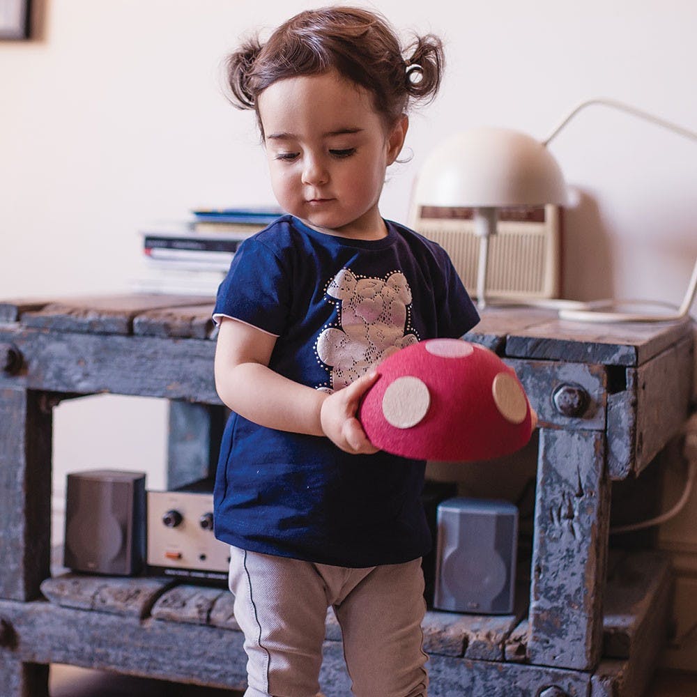 Naturel et durable, ce champignon en bois est aussi résistant aux chocs  ! Avec une texture douce et légère, il s’adaptera facilement aux petites mains de vos Minis.
