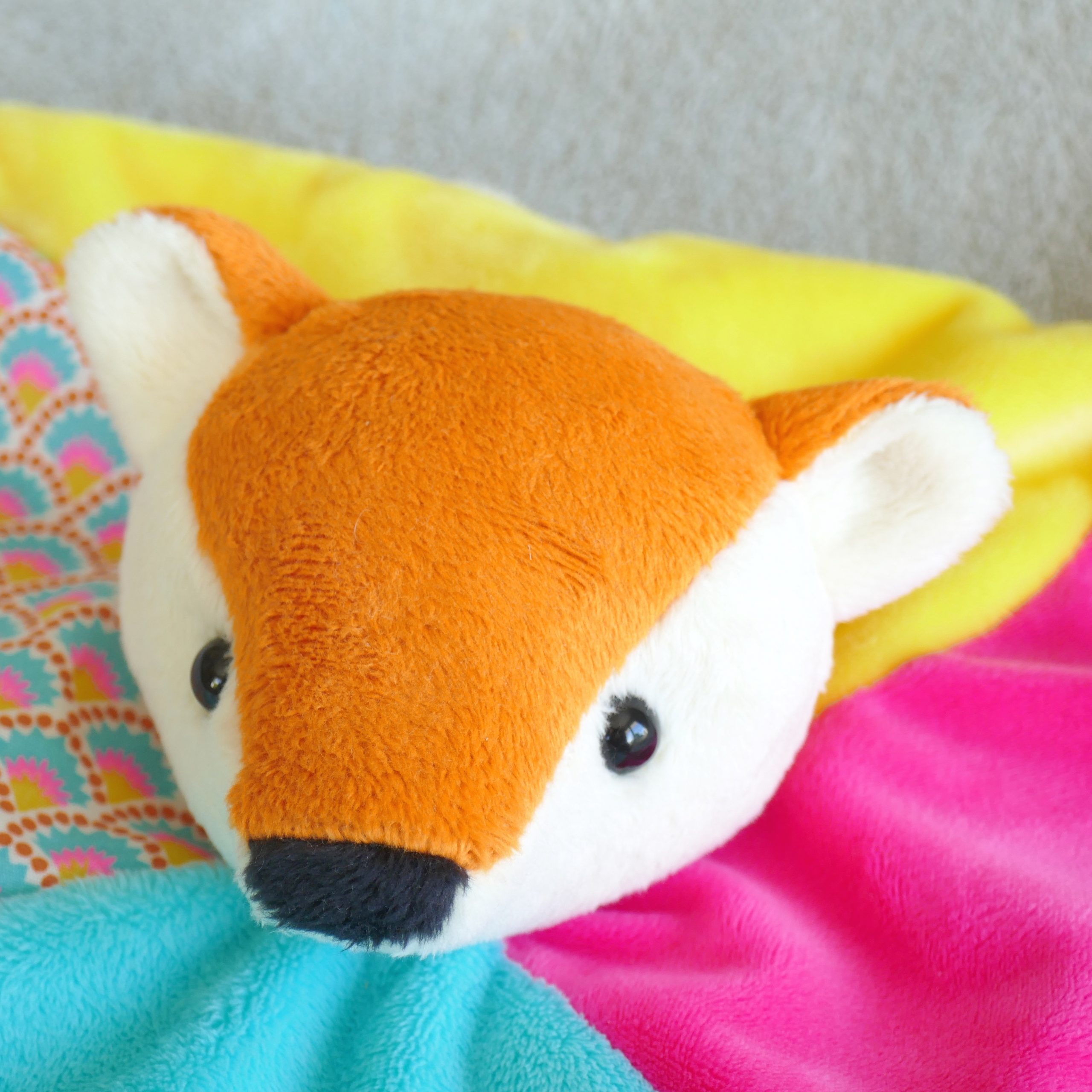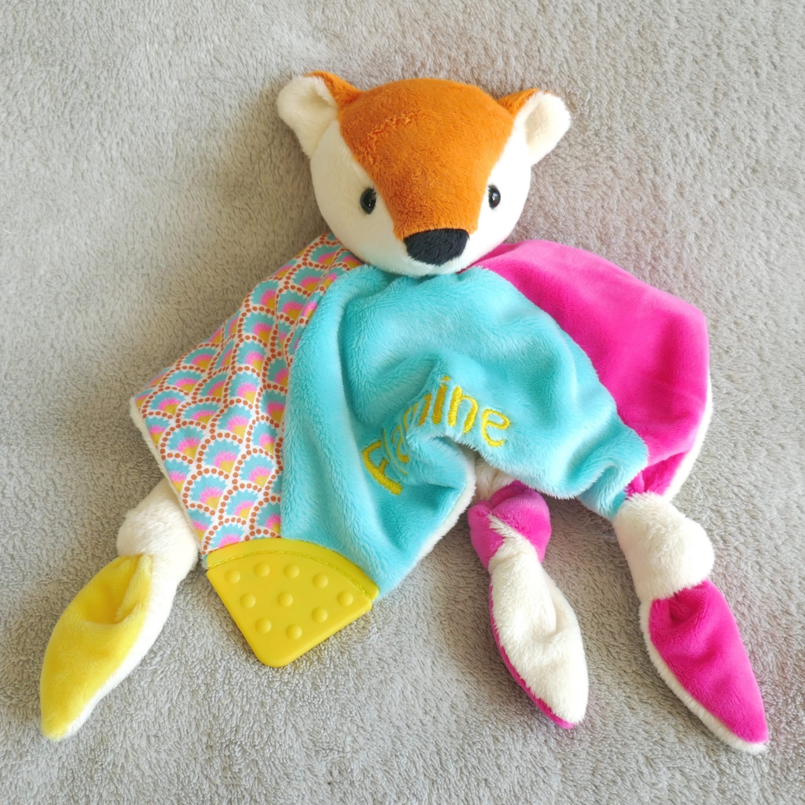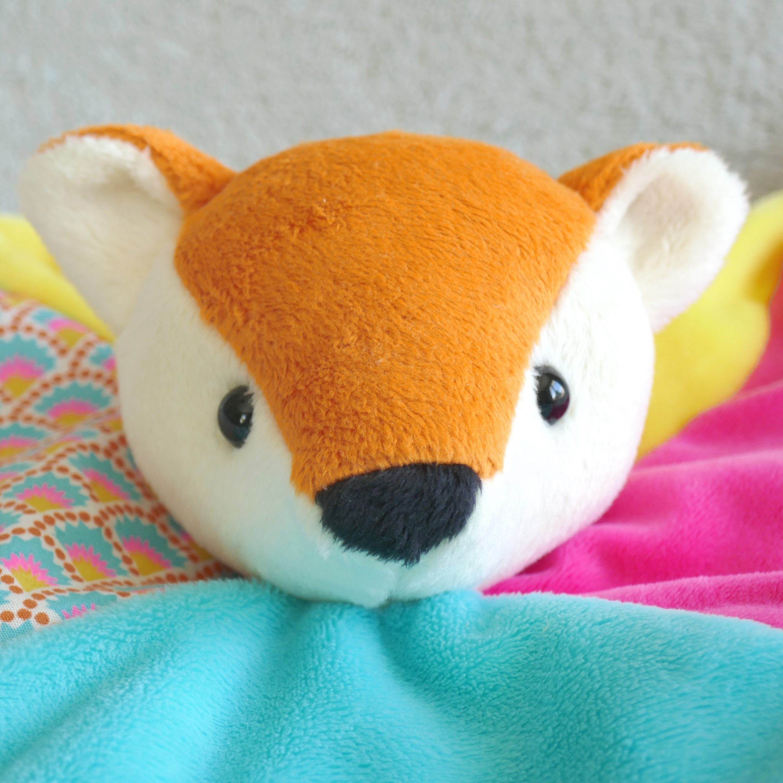 Patron de couture au format PDF : doudou plat avec tête de renard, nœuds et élément de dentition aux coins du doudou.