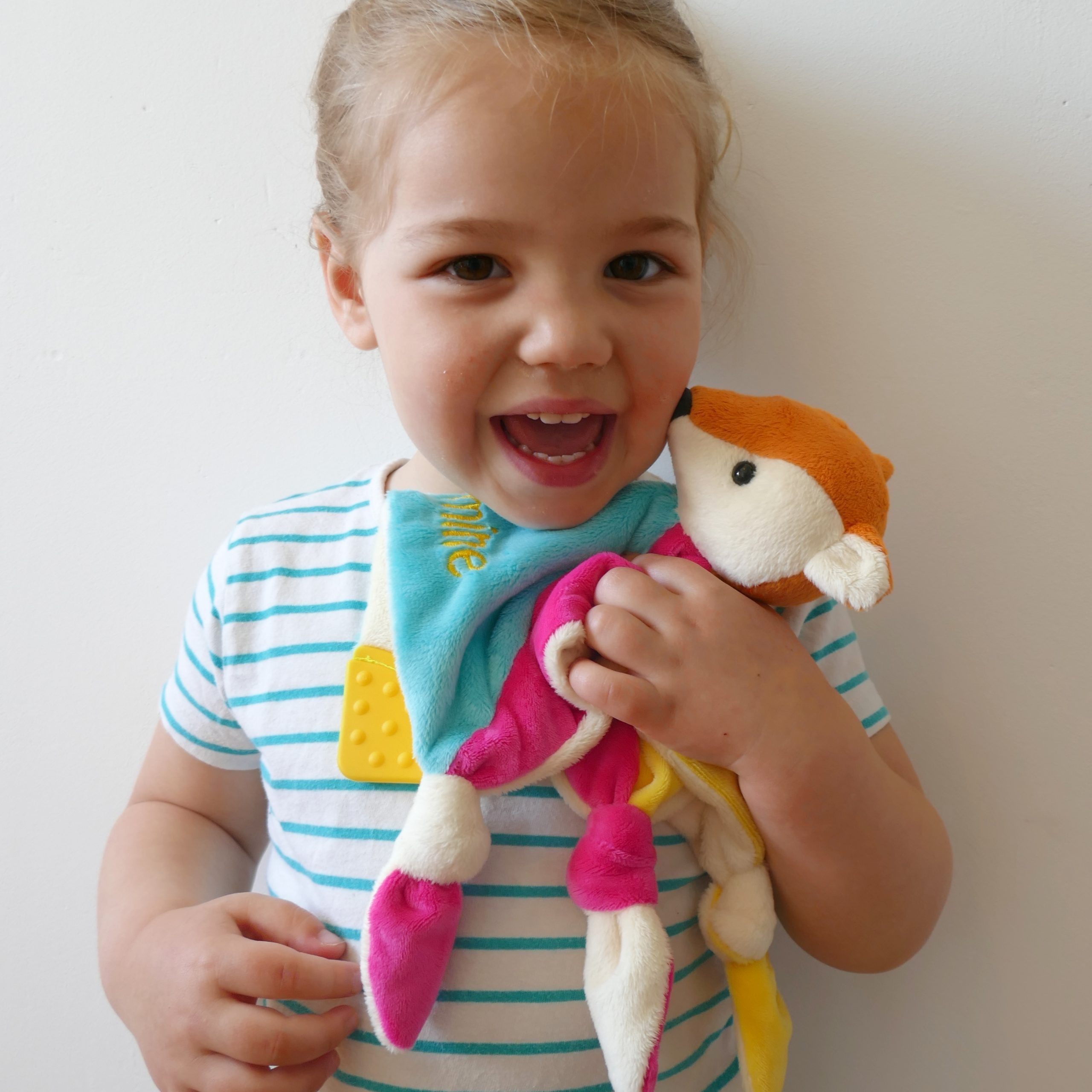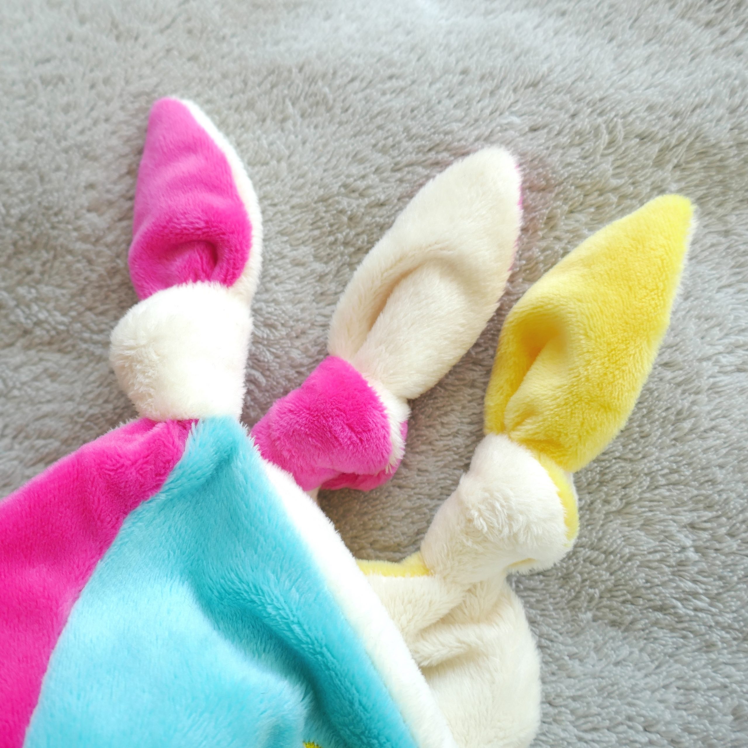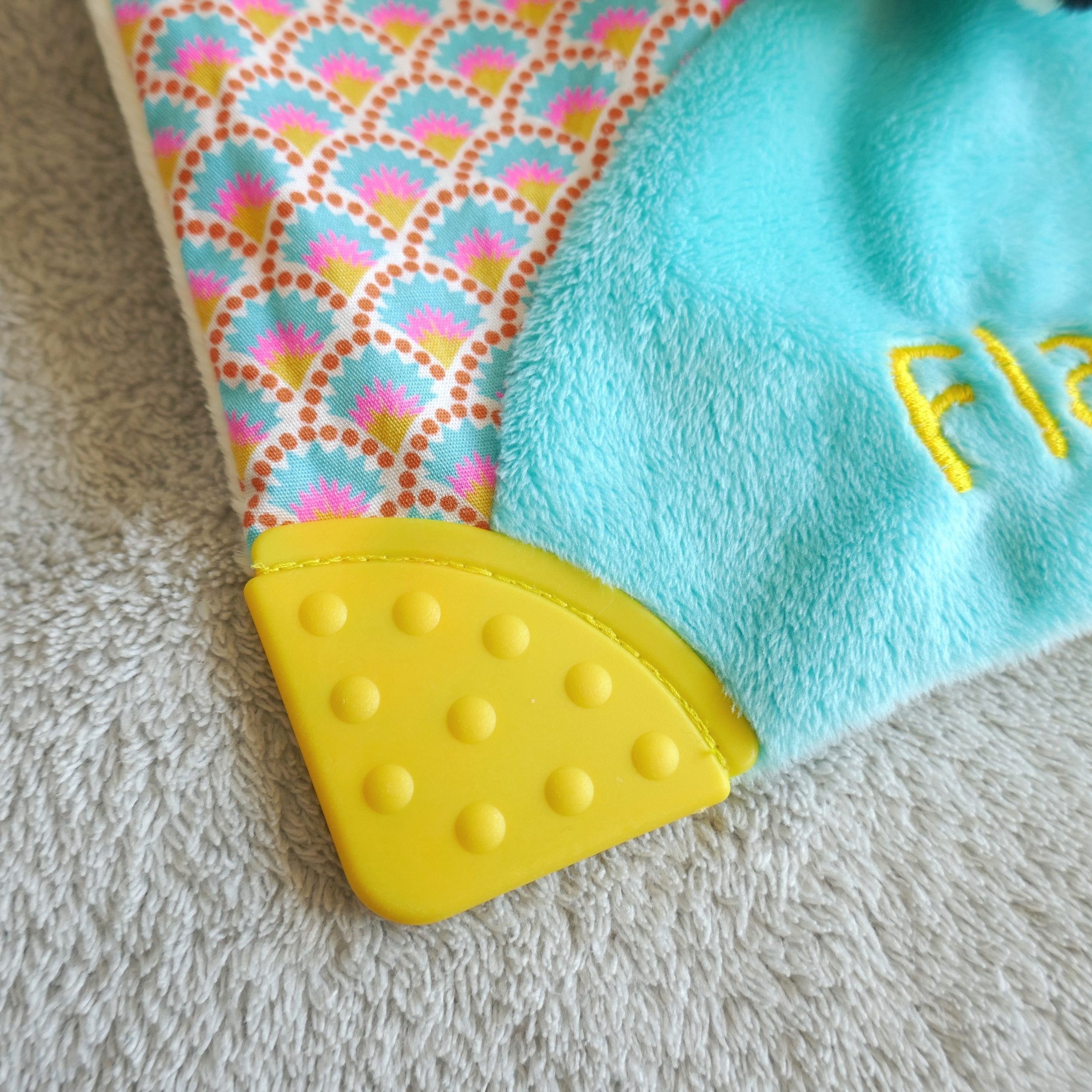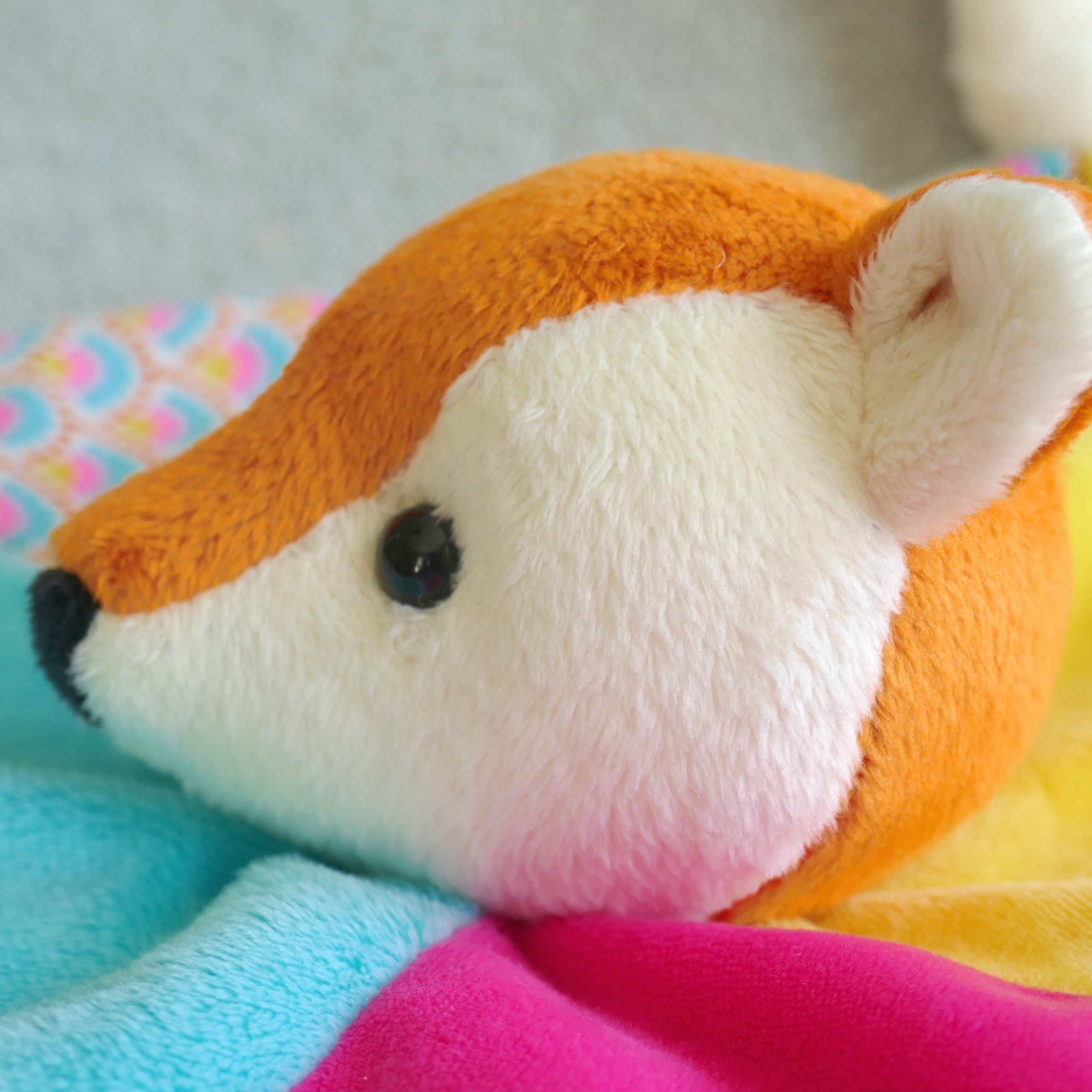 Patron de couture au format PDF : doudou plat avec tête de renard, nœuds et élément de dentition aux coins du doudou.