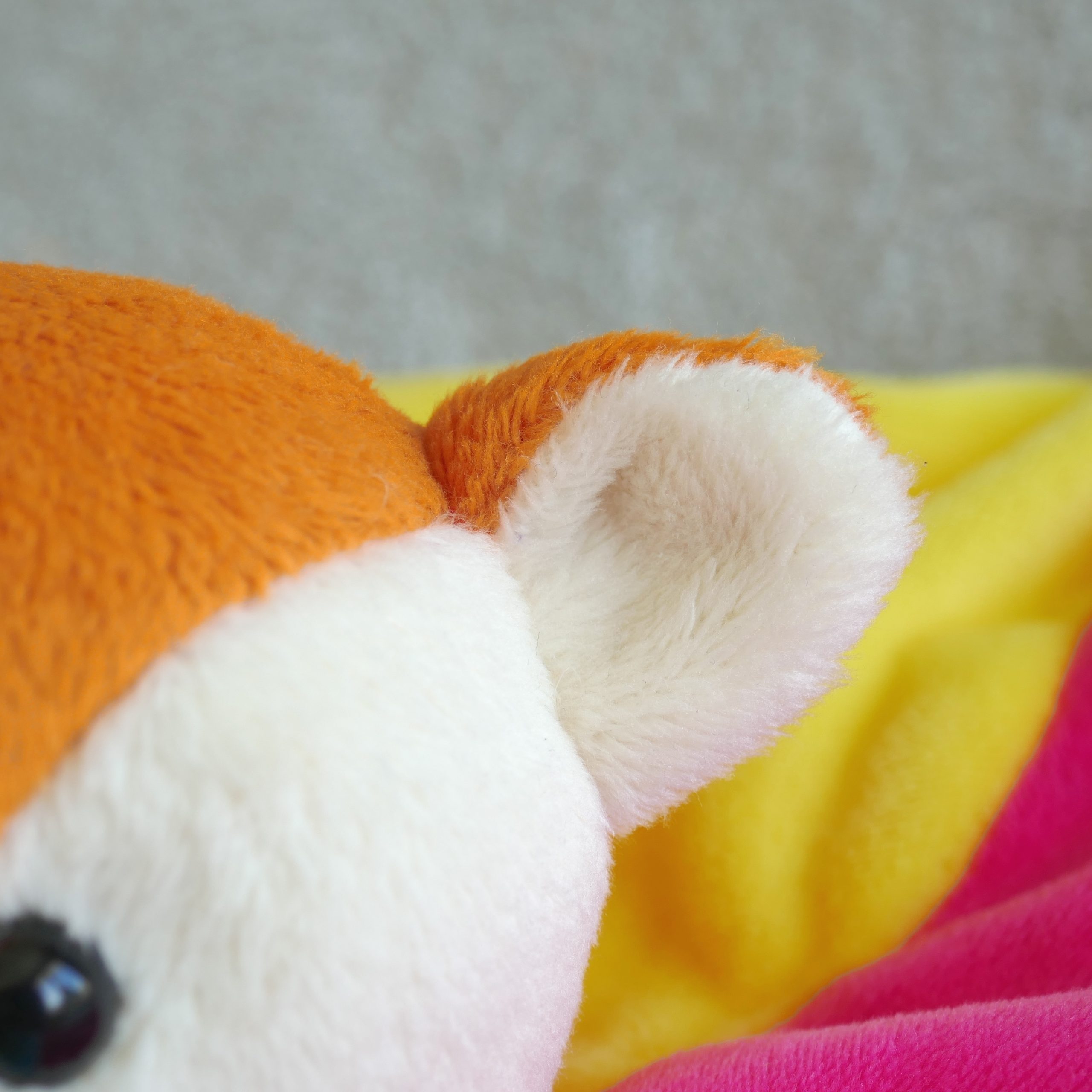 – Minkee orange 25 x 25 cm, écru 50 x 50 cm, turquoise 25 x 15 cm, fuchsia 20 x 50 cm, jaune 40 x 30 cm et noir (chute)