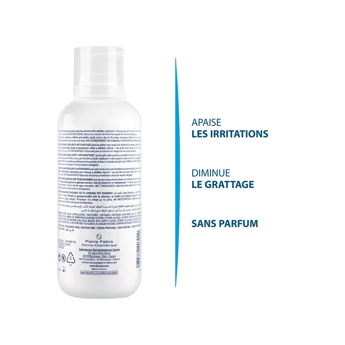 L’émollient s’applique 1 à 2 fois par jour, sur une peau propre, sur l’ensemble du corps en dehors des zones inflammatoires (lésions rouges).