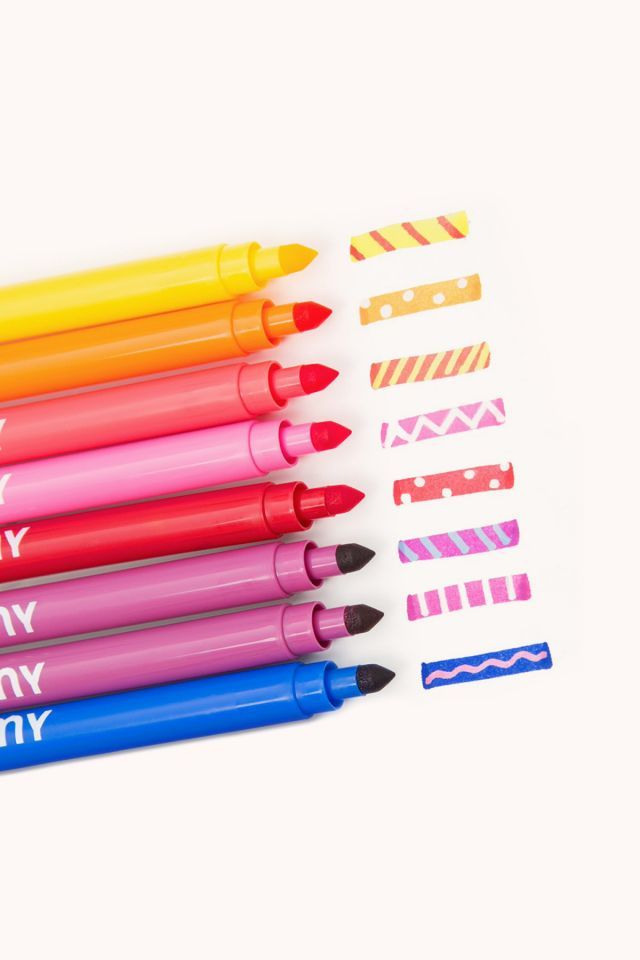 Complément indispensable des coloriages OMY, ces feutres double-pointe (fine et large) s’effacent ou changent de couleur grâce aux 2 effaceurs inclus.