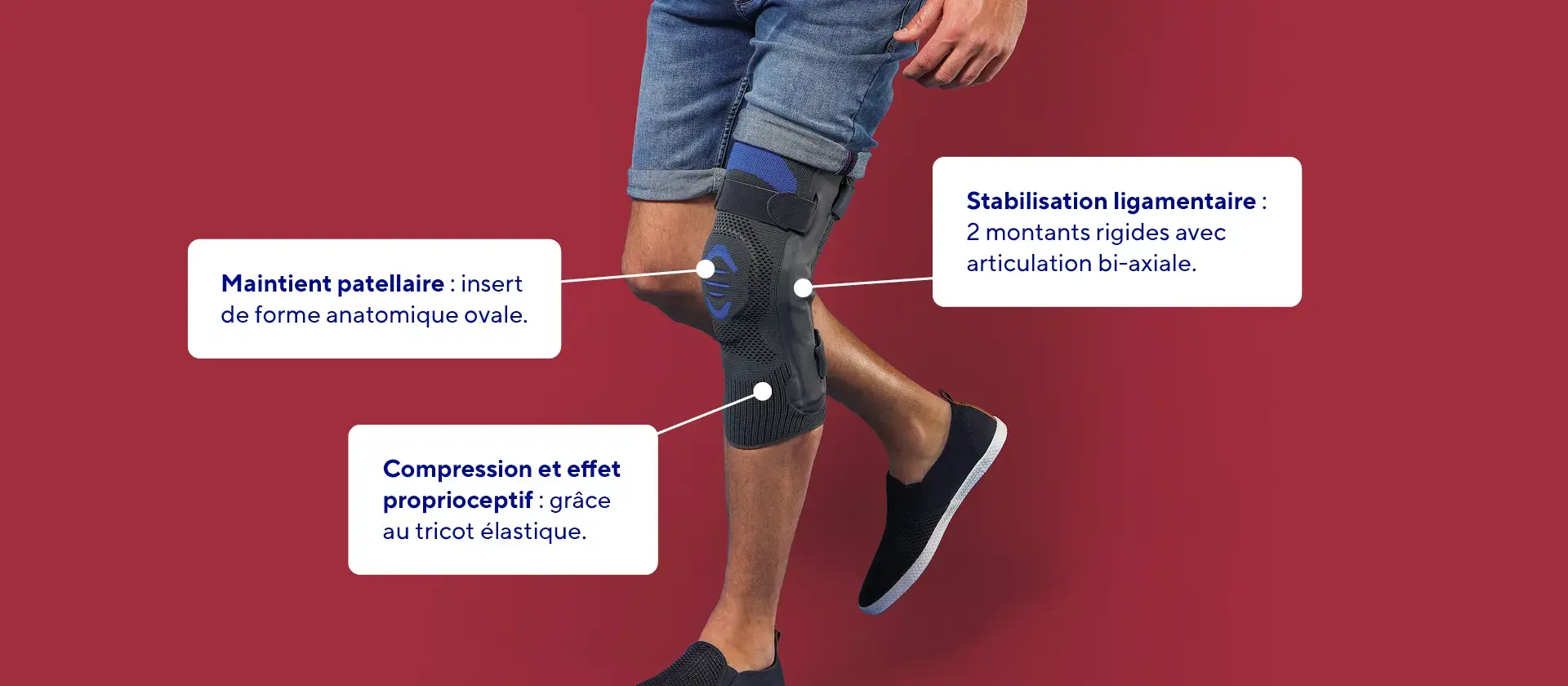 L’orthèse comporte un insert oval pour le maintien patellaire. Le tricot élastique compressif offre à la fois compression et effet proprioceptif.