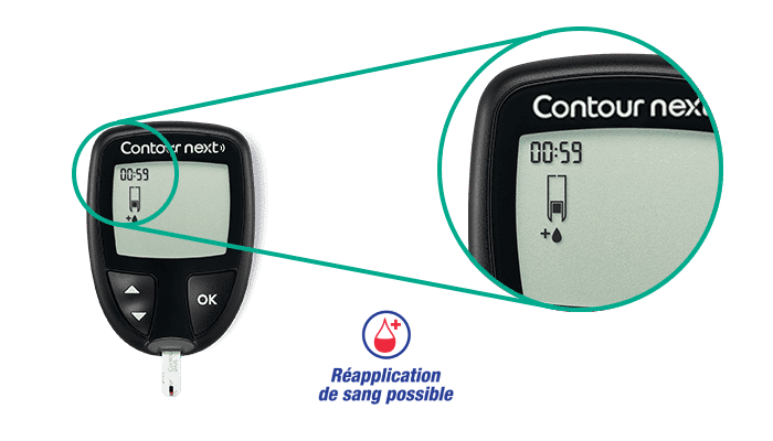 Le CONTOUR®NEXT est doté d’un écran affichant un décompte de 60 secondes qui donne aux patients la possibilité d’appliquer plus de sang sur la même tigette si le premier échantillon est insuffisant.