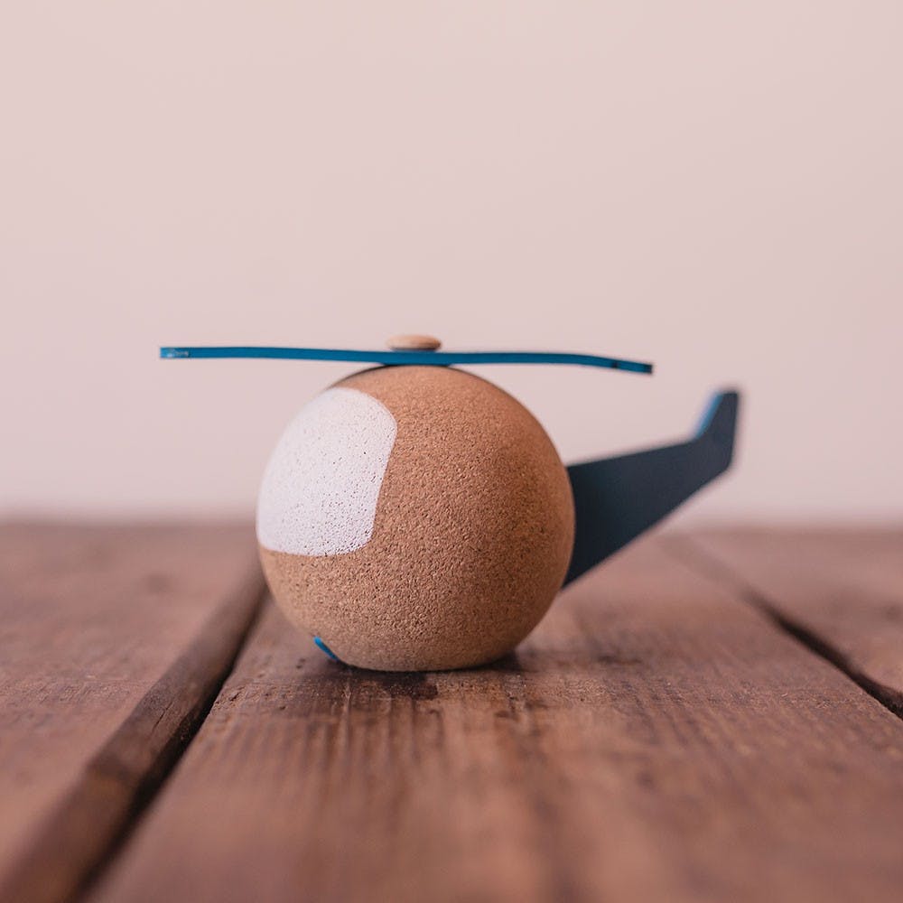En route pour l’aventure avec cet hélicoptère en bois… ou plutôt en liège ! Cette matière naturelle est issue de l’écorce du chêne liège.