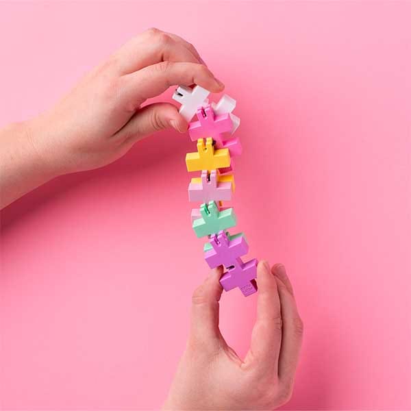 Découvrez le nouveau jouet anti-stress Plus-Plus. Il est composé de 6 pièces BIG reliées entre elles par un cordon élastique. Avec lui, construisez un large éventail de structures et de combinaisons.