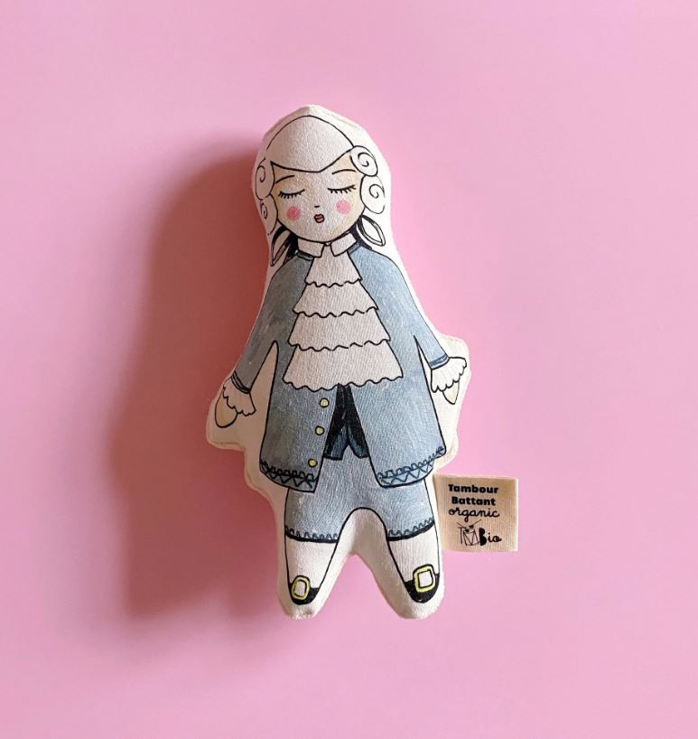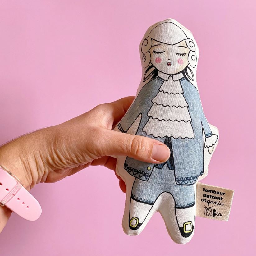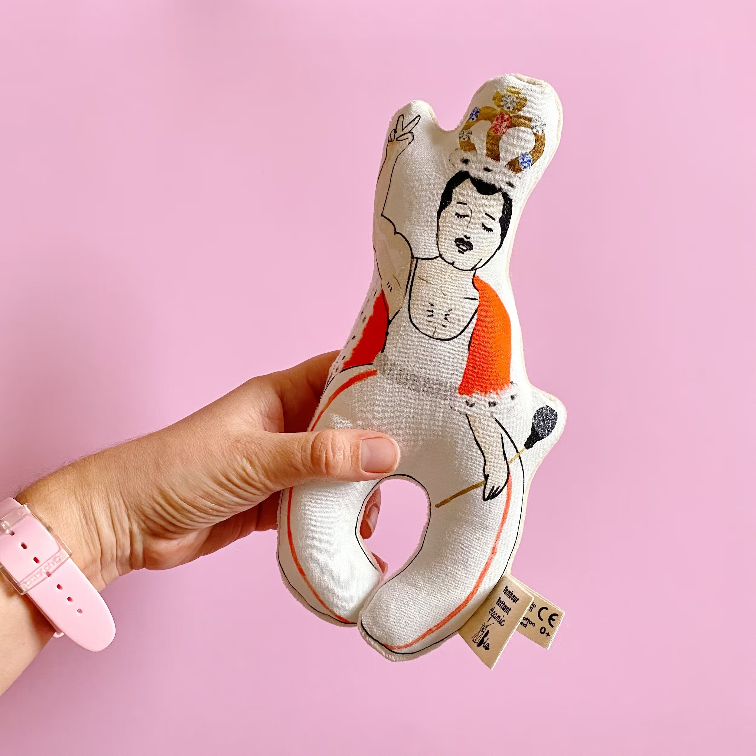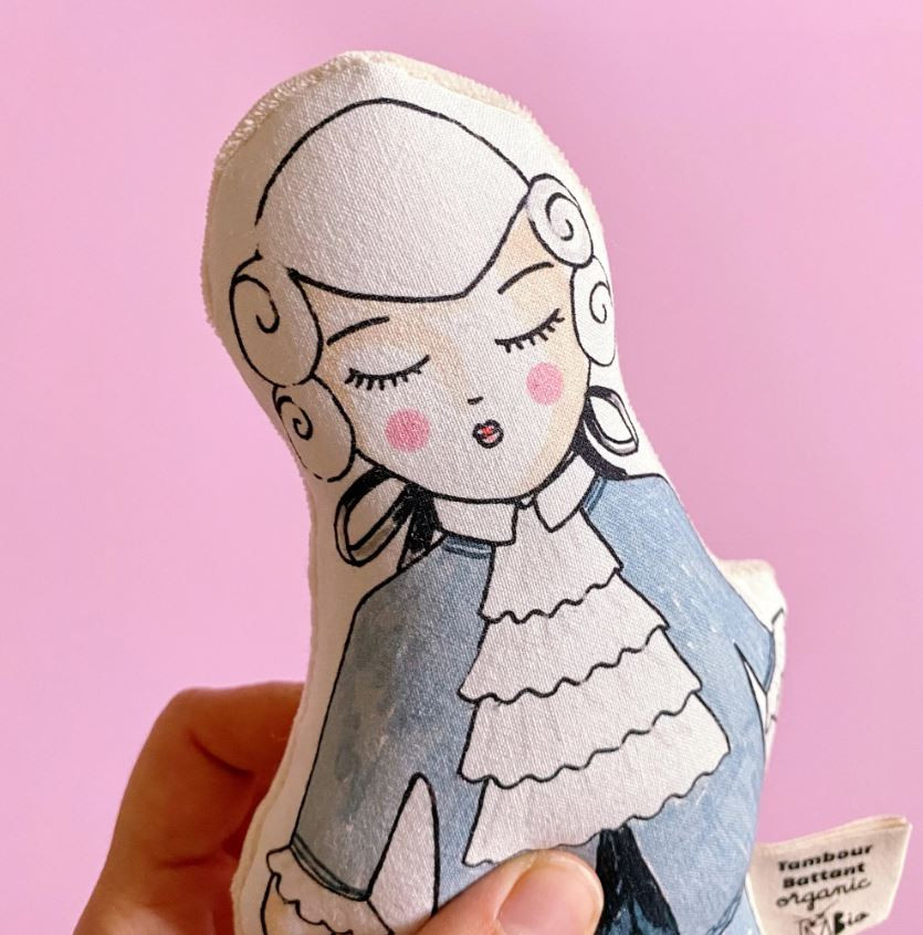 Le hochet est muni de 2 faces différentes fabriquées à partir de coton bio labellisé GOTS : l’une toute douce en velours de coton et l’autre à l’effigie de la célébrité préférée de papa ou maman !