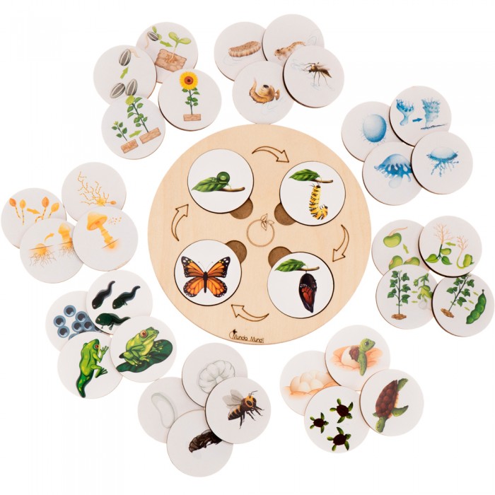 Ce jeu éducatif en bois met en image le cycle de vie des plantes et des animaux. C’est un jeu ludique et pédagogique qui permet à votre Mini de comprendre et d’apprendre les différentes étapes de développement :
