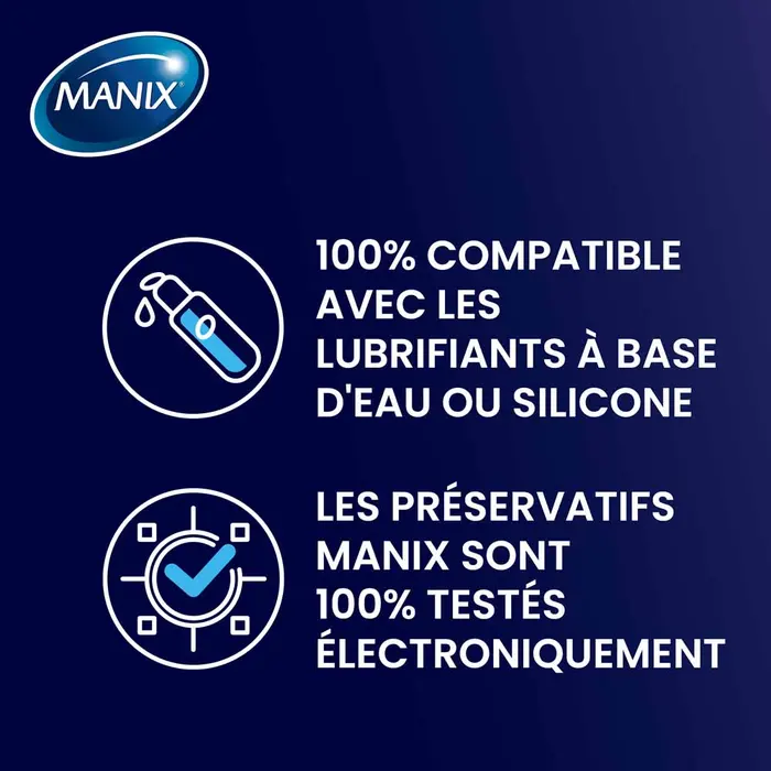 Fabriqué en latex premium de caoutchouc naturel et lubrifié avec un gel à base de silicone vanille, le Manix Contact Plus répond aux normes de qualité les plus strictes. Chaque préservatif est testé électroniquement à 100 % pour garantir une protection optimale contre les IST et les grossesses non désirées. Livré dans un emballage discret, il allie sécurité, confort et plaisir. Avec plus de 30 ans d’expertise, Manix reste la marque de confiance pour une sexualité naturelle, libre et exaltée.