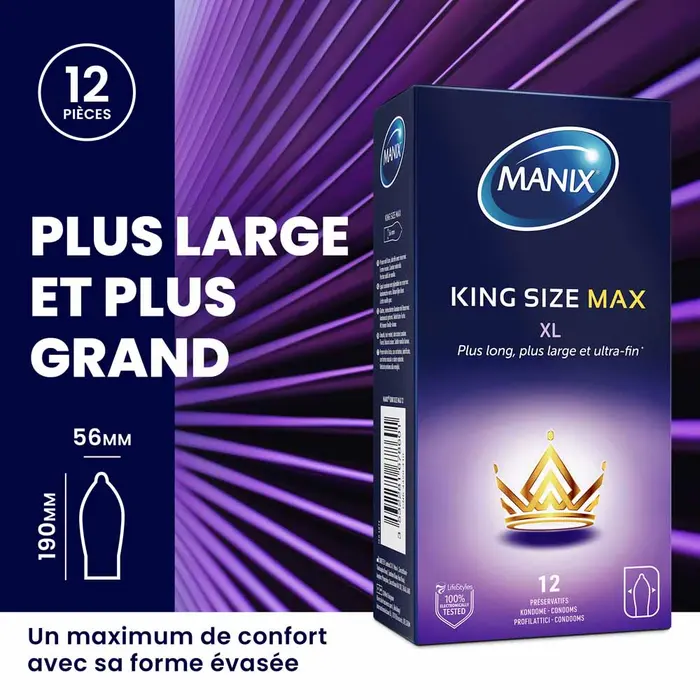 Profitez d’un confort exceptionnel et de sensations naturelles avec le Manix King Size Max XL, le préservatif grande taille spécialement conçu pour les hommes recherchant plus d’aisance sans compromis sur le plaisir. Grâce à sa forme évasée, sa texture ultra-fine et sa largeur augmentée, il garantit une sensation peau contre peau plus fluide et naturelle tout en assurant une protection optimale.