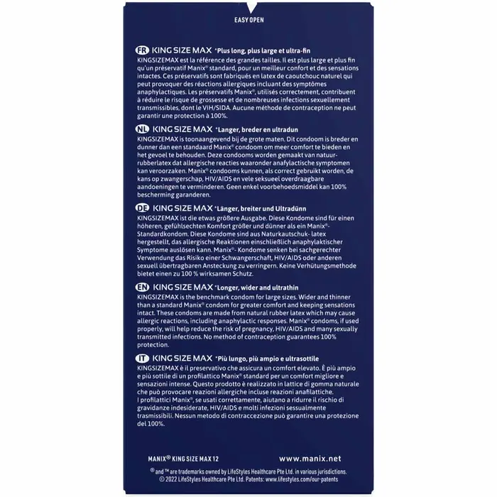 Le Manix King Size Max se distingue par ses dimensions généreuses — 56 mm de largeur et 190 mm de longueur — offrant une adaptation parfaite et un maintien sûr pour un confort inégalé. Fabriqué en latex premium de caoutchouc naturel, lisse, lubrifié et doté d’un réservoir, il combine résistance, douceur et finesse pour des rapports plus agréables et naturels. Son effet ultra-fin préserve la sensibilité tout en assurant un contact authentique et sensuel.