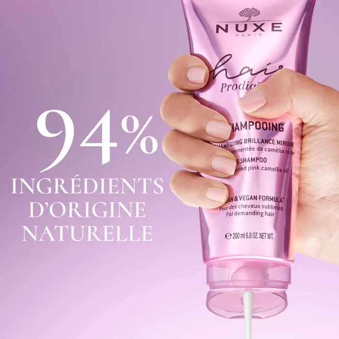 Né de l’expertise du Laboratoire Nuxe sur les huiles végétales, le Shampooing Brillance Miroir lave et parfume délicatement les cheveux. Formule sans silicone et sans sulfate*, ce shampooing, à l’huile fermentée de camélia rose, nourrit sans alourdir la fibre capillaire. Sa texture lait à la fragrance mythique de l’Huile Prodigieuse® enveloppe les cheveux pour un rituel sensoriel inouï. Les cheveux sont éclatants de brillance au toucher soyeux addictif.