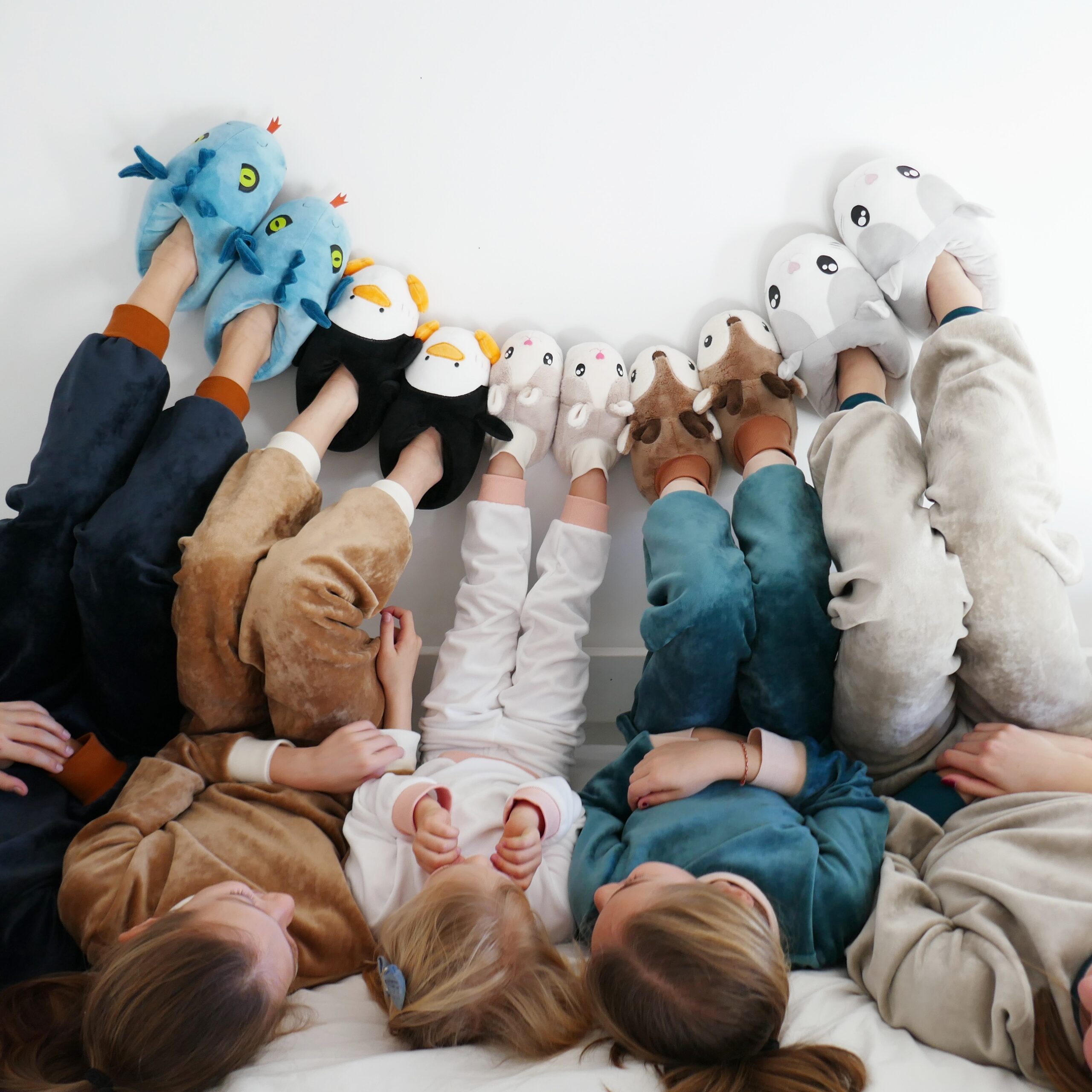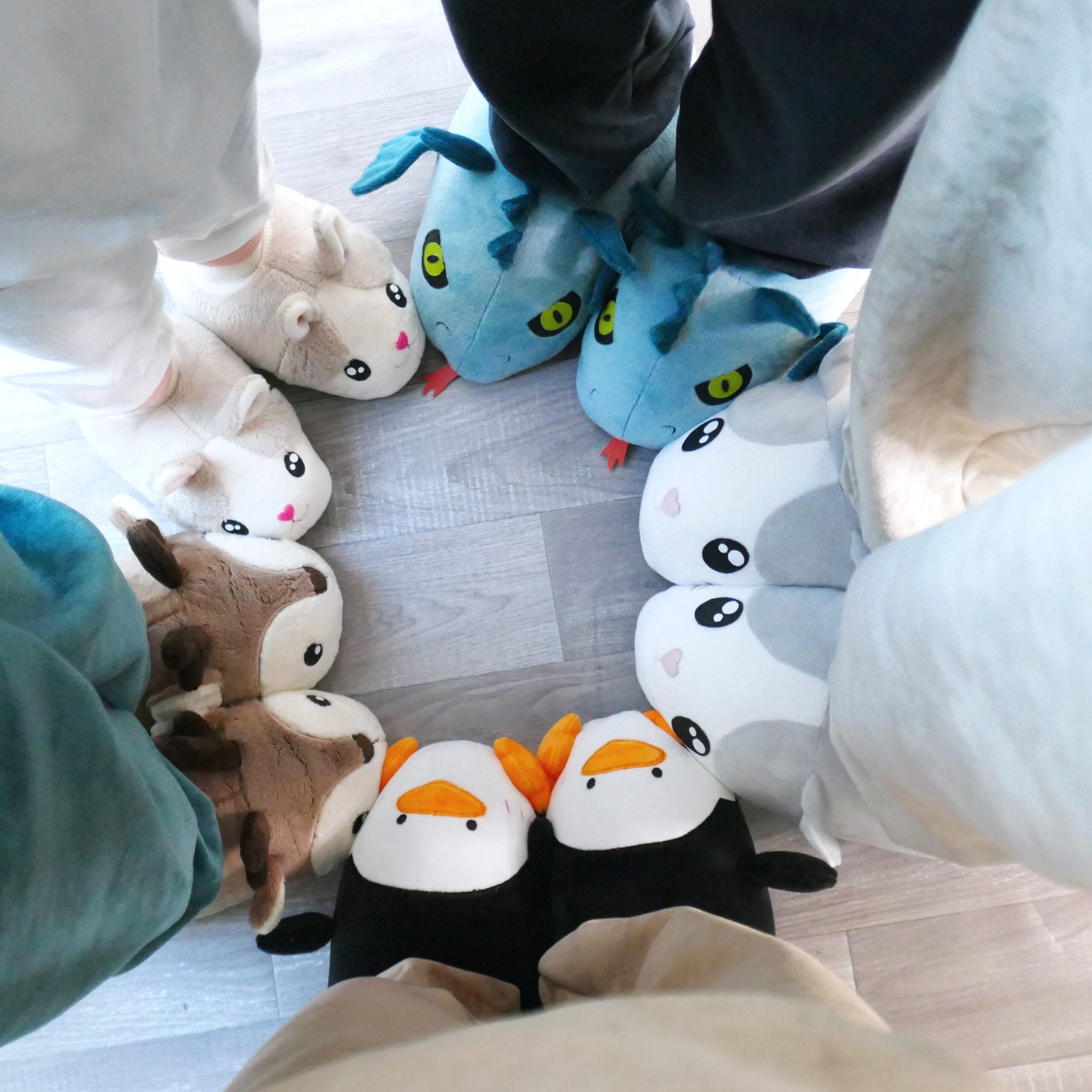Patron de couture au format PDF, téléchargement numérique instantané, ou au format papier (pochette 18 x 22 x 1 cm). Patron de gros chaussons rigolos cocooning unis ou avec 5 customisations possibles : lapin, chat, cerf, pingouin ou dragon. Pointure 21 au 40 (FR). Purchase the pattern in English on Etsy or The Foldline.