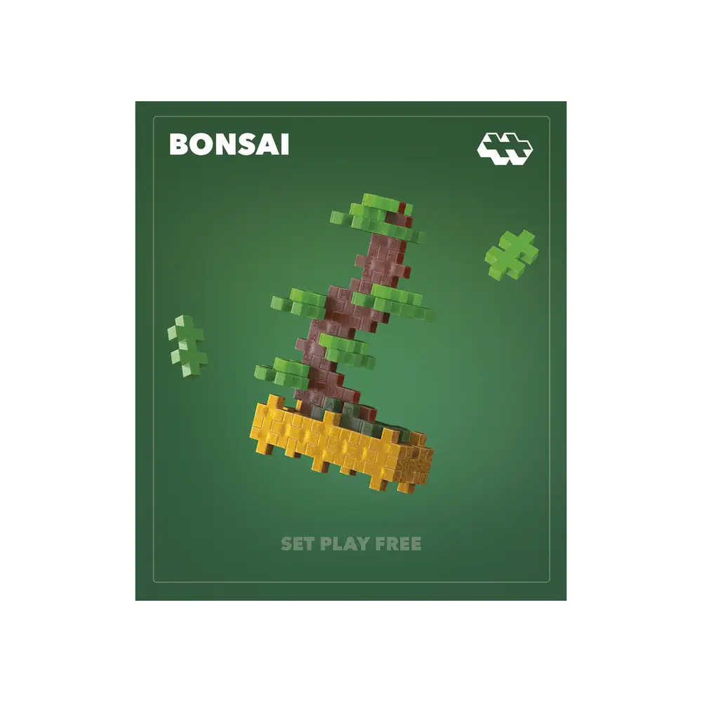 La Pop Plantes bonsaï verte est une enveloppe qui contient 49 pièces de Plus-Plus CLASSIC et une notice de construction pour réaliser le bonsaï présent sur le packaging.