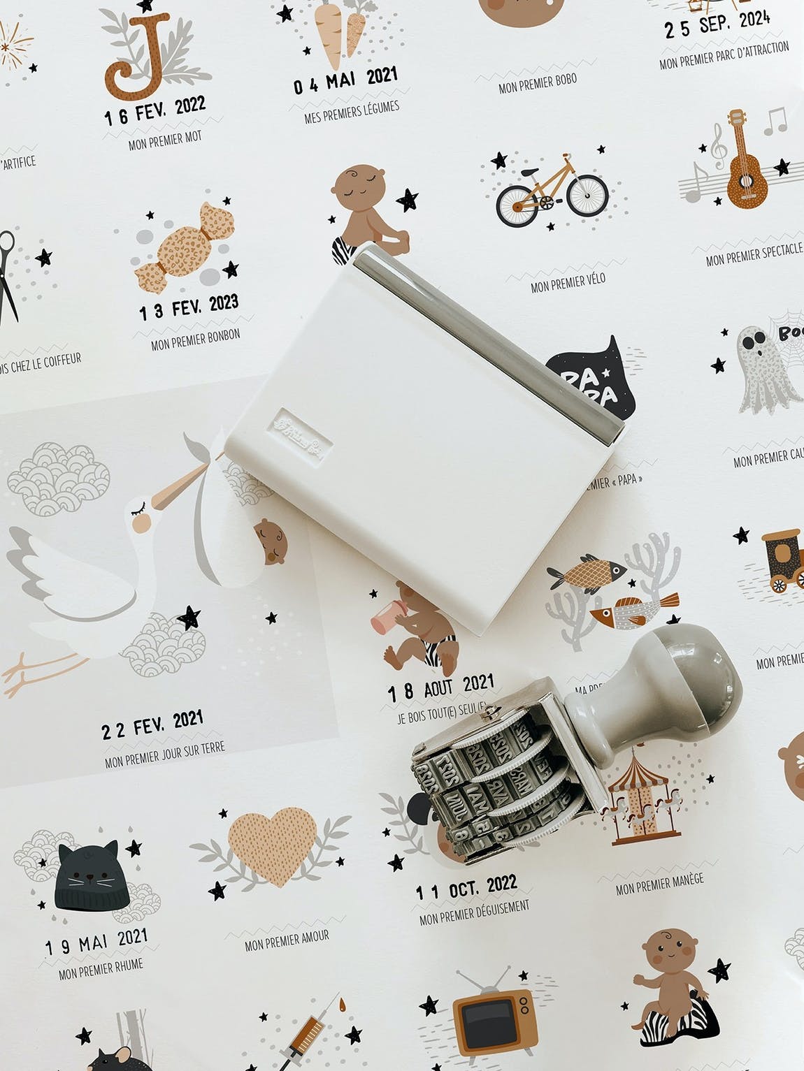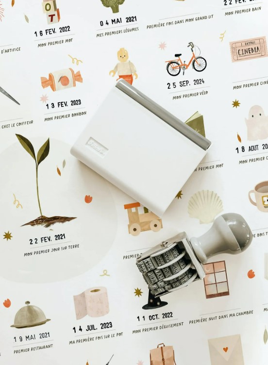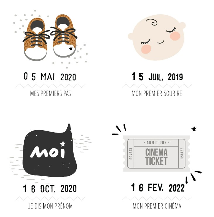 A chaque nouvelle étape, encrez la date sur l’affiche afin d’immortaliser les différents moments (son premier bobo, son premier brossage de dents, sa première bêtise etc…) et ainsi vous souvenir de toutes ces petites étapes qui vous ont rempli de joie ou pas.