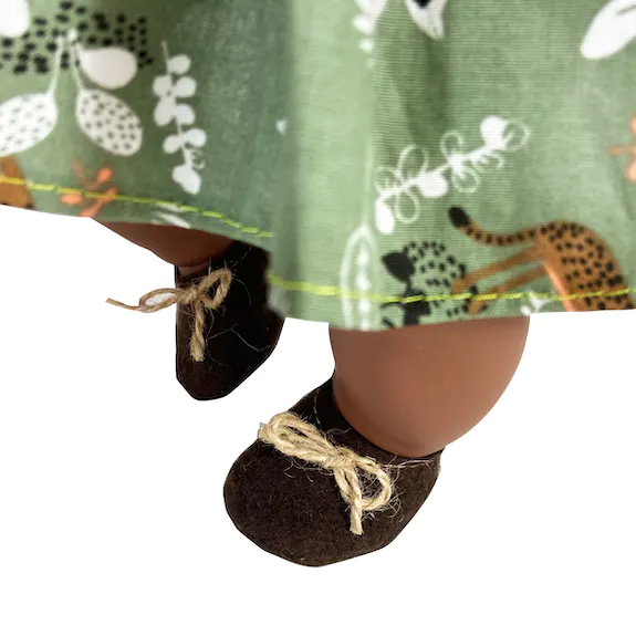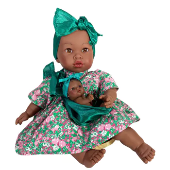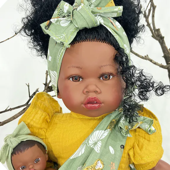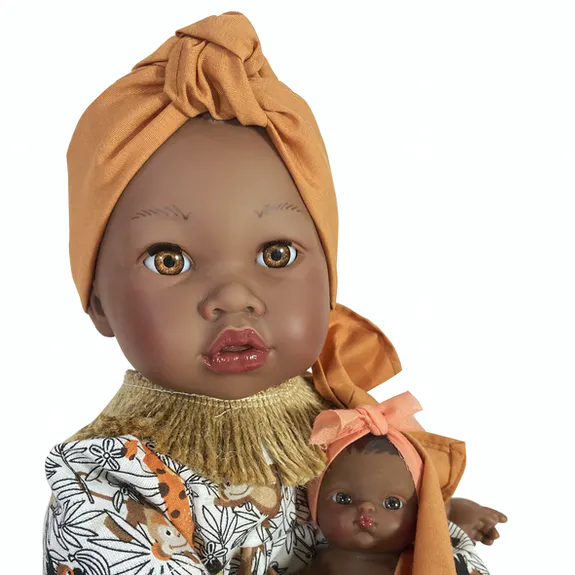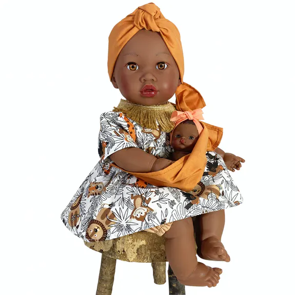 La poupée africaine de la marque Nines représente un poupon aux traits africains et aux vêtements ethniques aux couleurs acidulées. La version fille porte un bébé en portage, attaché au corps de la Maman.