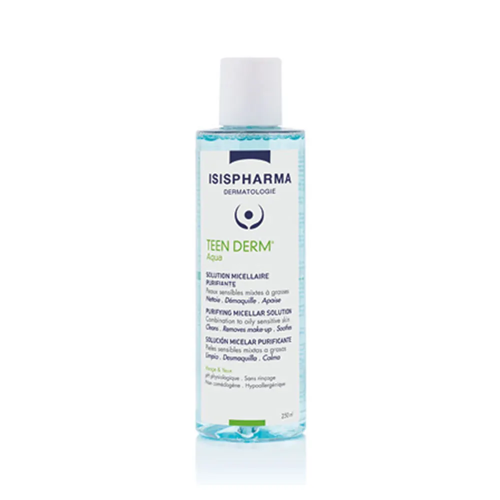 o Associée à d’autres produits de la gamme Teen Derm®, l’eau micellaire Teen Derm® Aqua participe à réduire visiblement les imperfections cutanées.