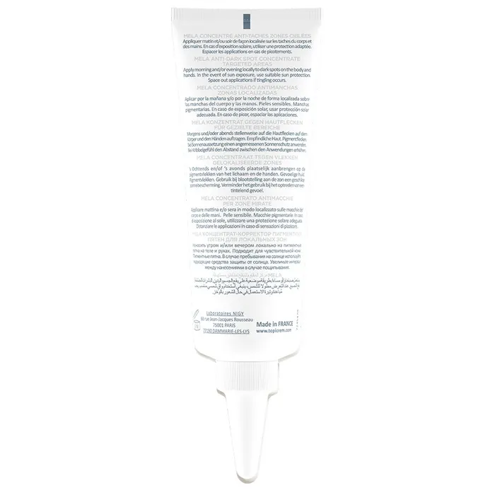 MELA Concentré Anti-Taches Zones Ciblées est le soin d’attaque anti-taches au complexe breveté(1) pour peaux sensibles à l’efficacité rapide et prolongée qui corrige tous types de taches et hyperpigmentations localisées du corps, même installées et prévient leur réapparition. Action intensive anti-taches dès 7 jours(2). Il unifie le teint, ravive l’éclat et hydrate pendant 24 heures(3). Destiné aux adultes et adolescents à partir de 12 ans pour le corps et les mains.