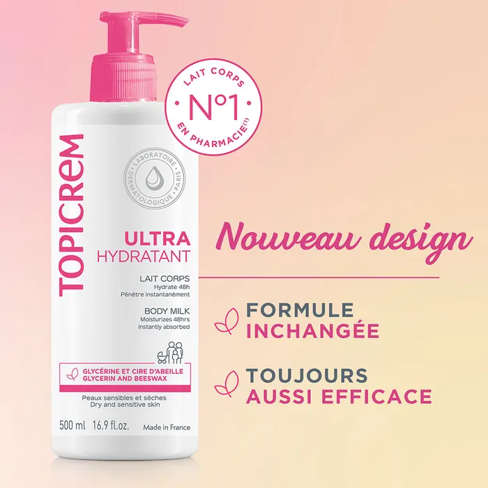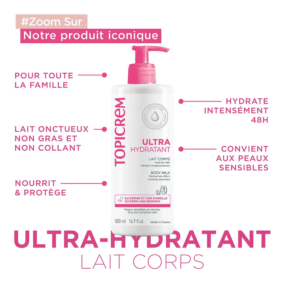 L’Ultra Hydratant Lait Corps TOPICREM hydrate 48h*, nourrit et protège la peau de toute la famille. Non collant, non gras, il pénètre instantanément et permet un habillage rapide. Sa texture onctueuse et son parfum iconique délicat, aux notes de nénuphar, de muguet et de cèdre, apportent un moment de bien-être à l’application.