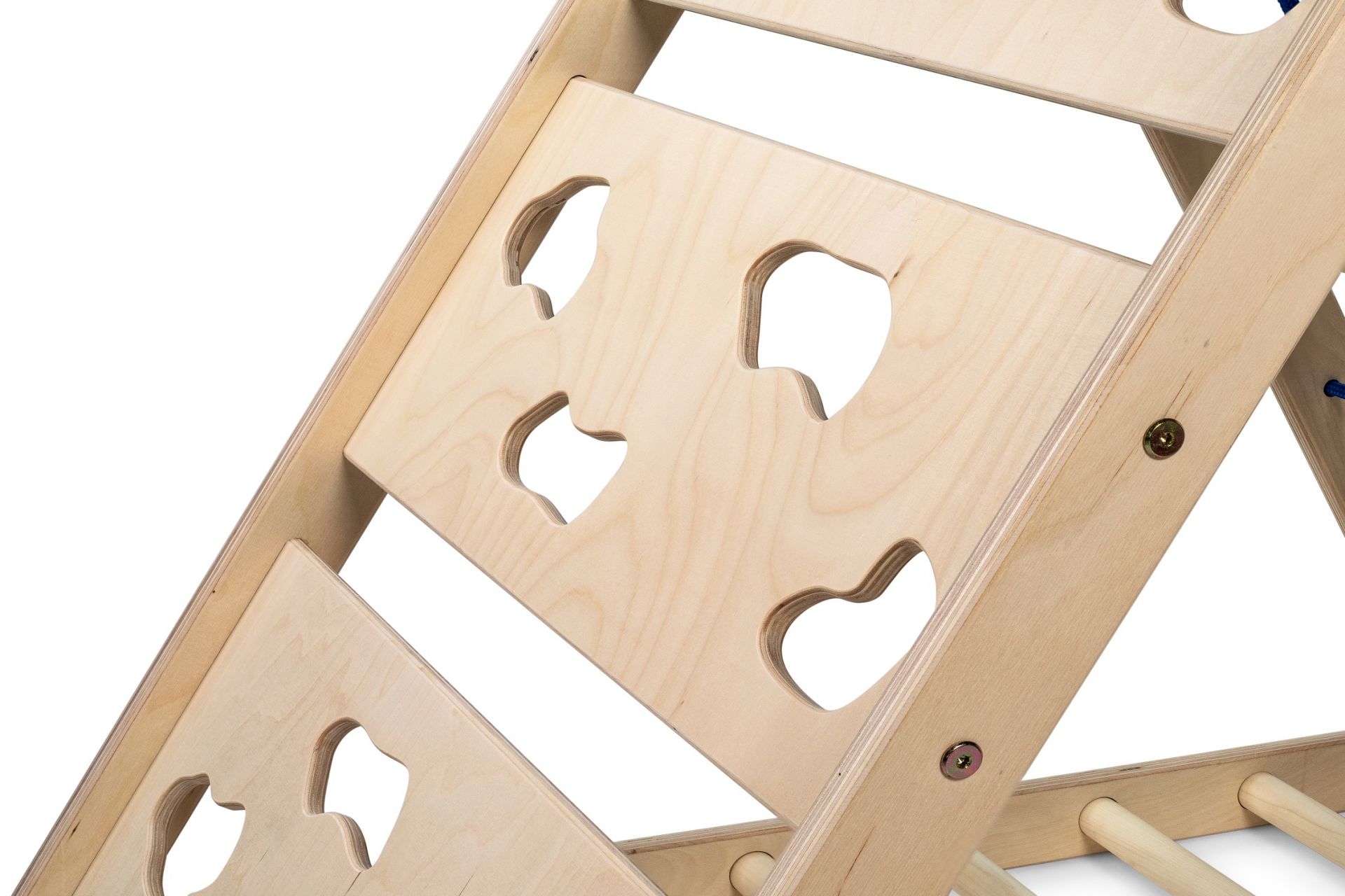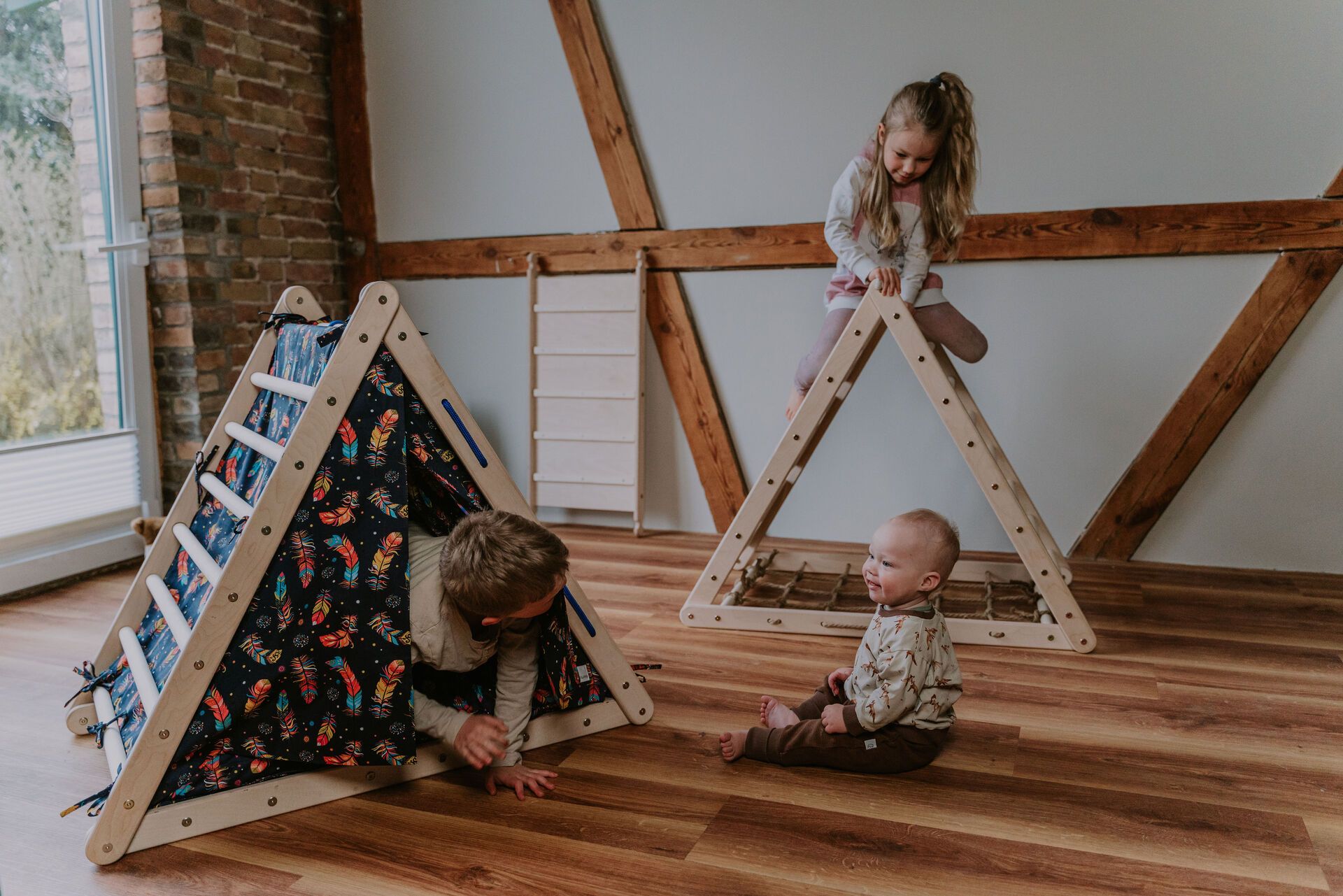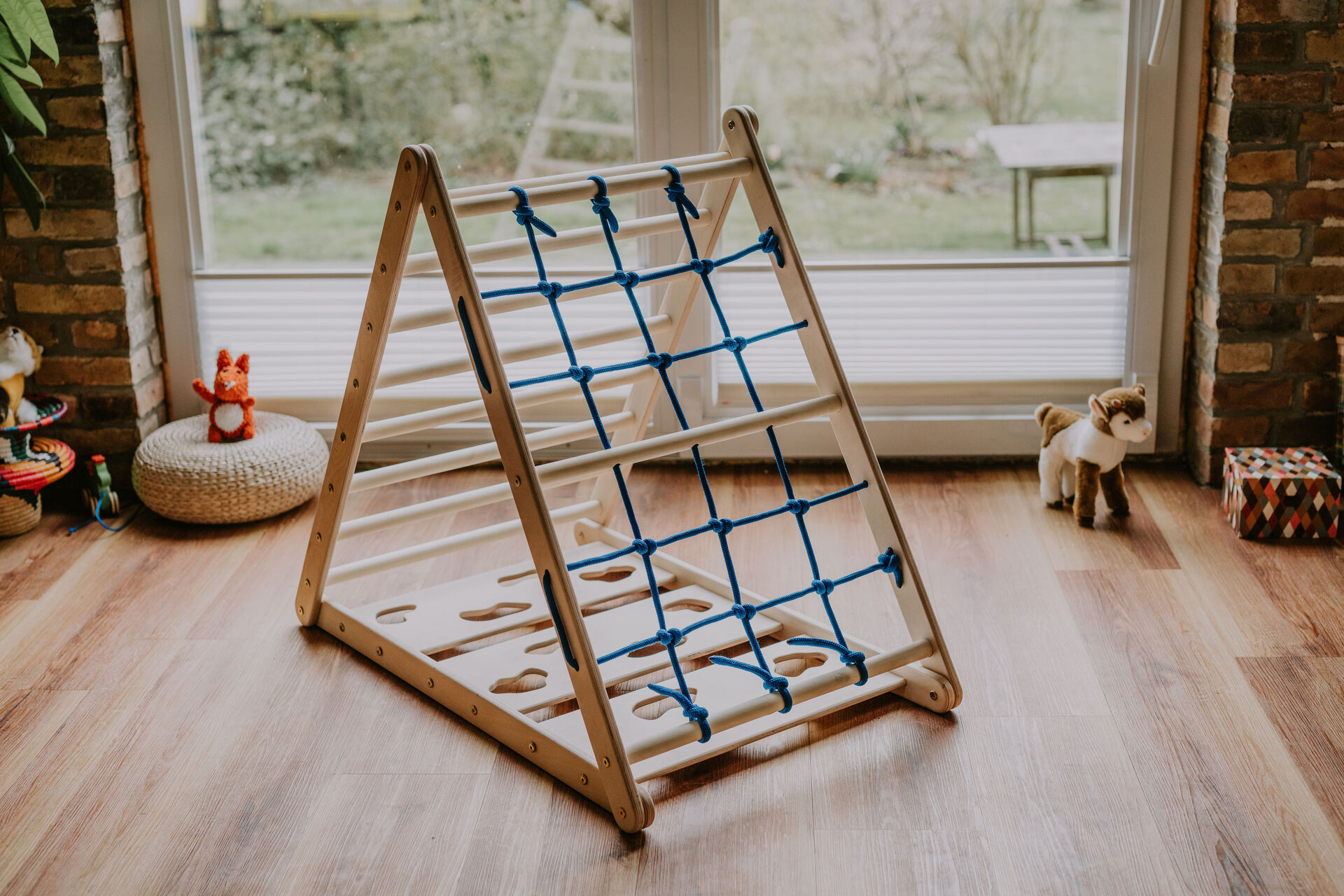 Chaque côté va permettre à votre enfant de tester de nouveaux appuis, de travailler son équilibre autrement et sa coordination. Les sensations sur les mains et les pieds seront totalement différentes de chaque côté. Il offre donc plus d’opportunités qu’un simple triangle de Pikler.