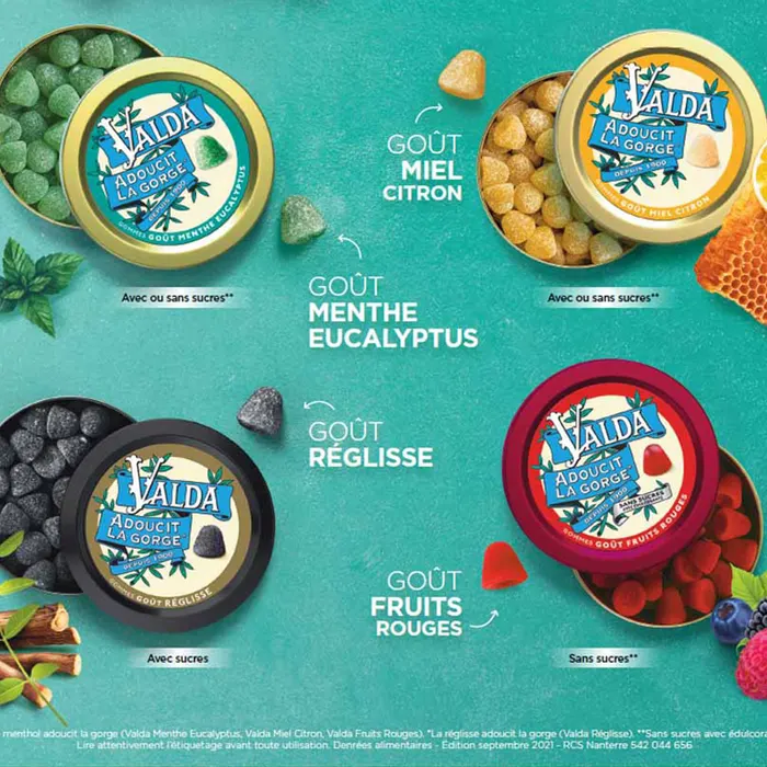 Les pastilles Valda sont désormais disponibles aux goûts miel/citron, réglisse et menthe/eucalyptus.